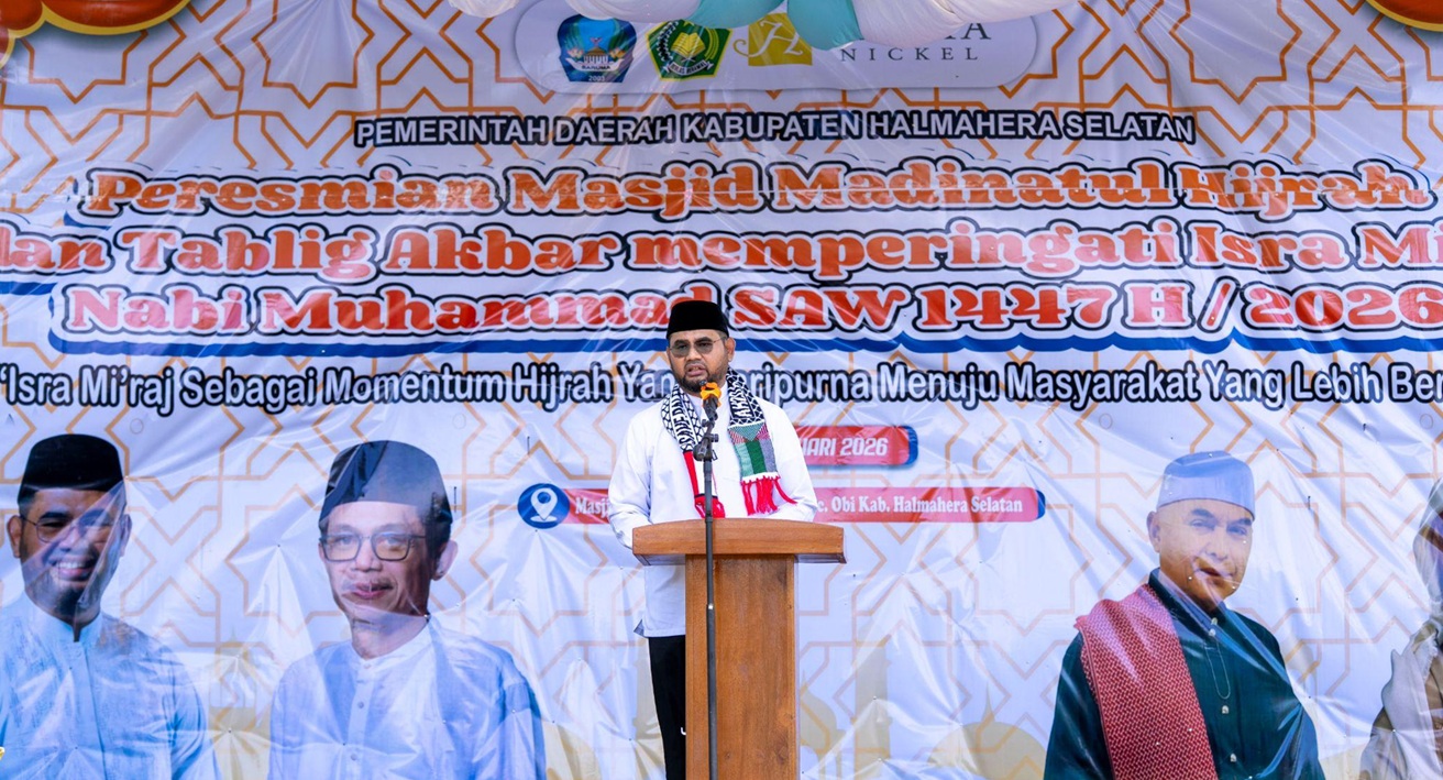 Halmahera Selatan – Pemerintah Kabupaten Halmahera Selatan meresmikan Masjid Madinatul Hijrah yang berlokasi di permukiman baru Desa Kawasi, Kecamatan Obi, Kamis (22/1/2026). Peresmian ini dilakukan langsung oleh Hasan Ali Bassam Kasuba, bertepatan dengan peringatan Isra Mi’raj Nabi Muhammad SAW 1447 Hijriah.