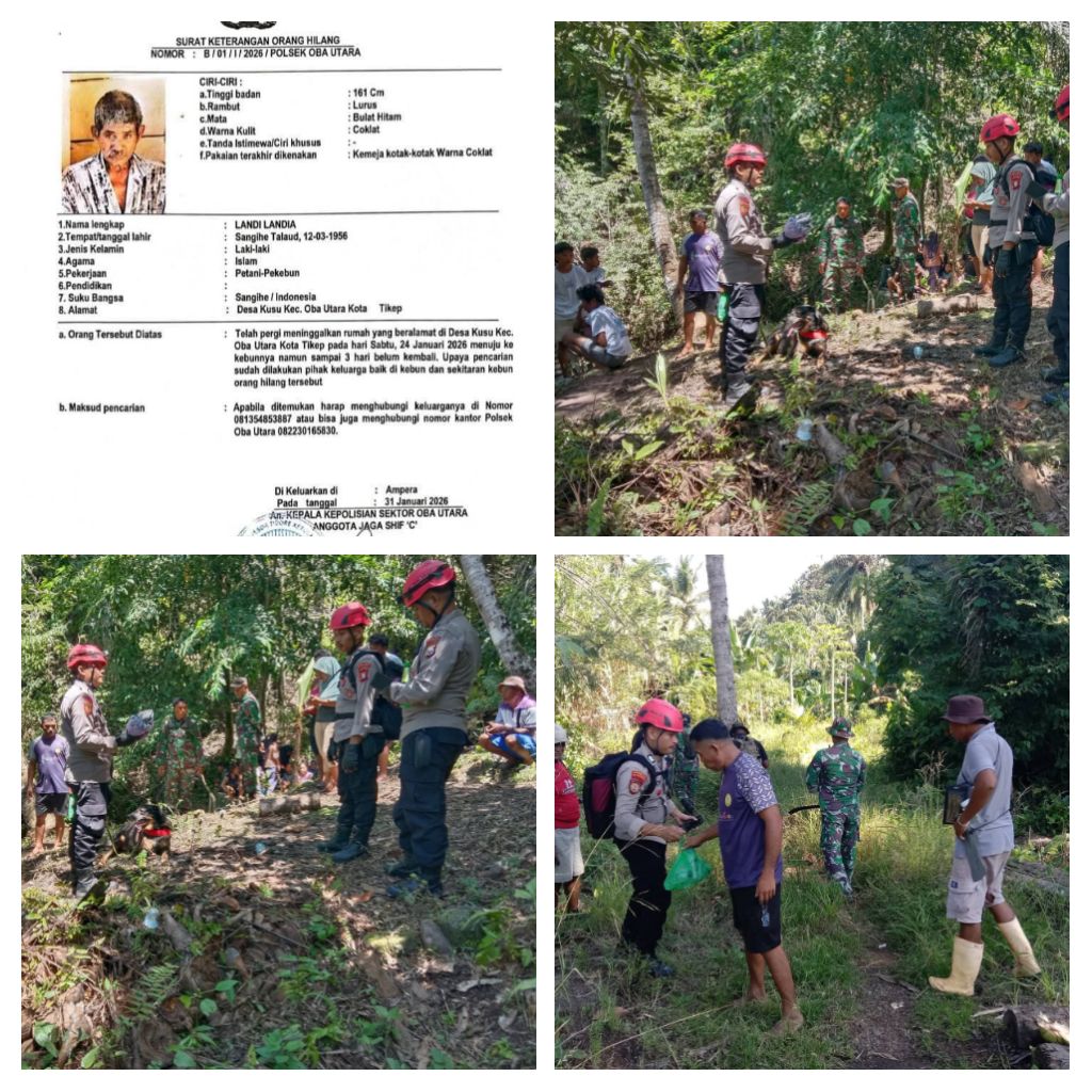 Kapolsek Oba Utara melalui keterangan tertulis menyebutkan, Landi Landia terakhir kali terlihat pada Sabtu, 24 Januari 2026, saat meninggalkan rumahnya di Desa Kusu dengan tujuan menuju kebun.