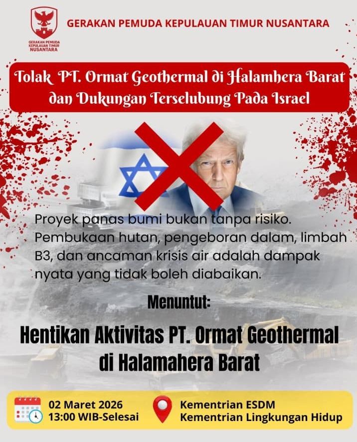 HALMAHERA BARAT – Gerakan Pemuda Kepulauan Timur Nusantara (GPKTN) menyerukan penolakan terhadap aktivitas PT Ormat Geothermal di Kabupaten Halmahera Barat, Maluku Utara. Seruan tersebut disampaikan melalui aksi yang direncanakan berlangsung pada 2 Maret 2026, pukul 13.00 WIB hingga selesai, dengan titik penyampaian aspirasi di Kementerian Energi dan Sumber Daya Mineral (ESDM) serta Kementerian Lingkungan Hidup.
